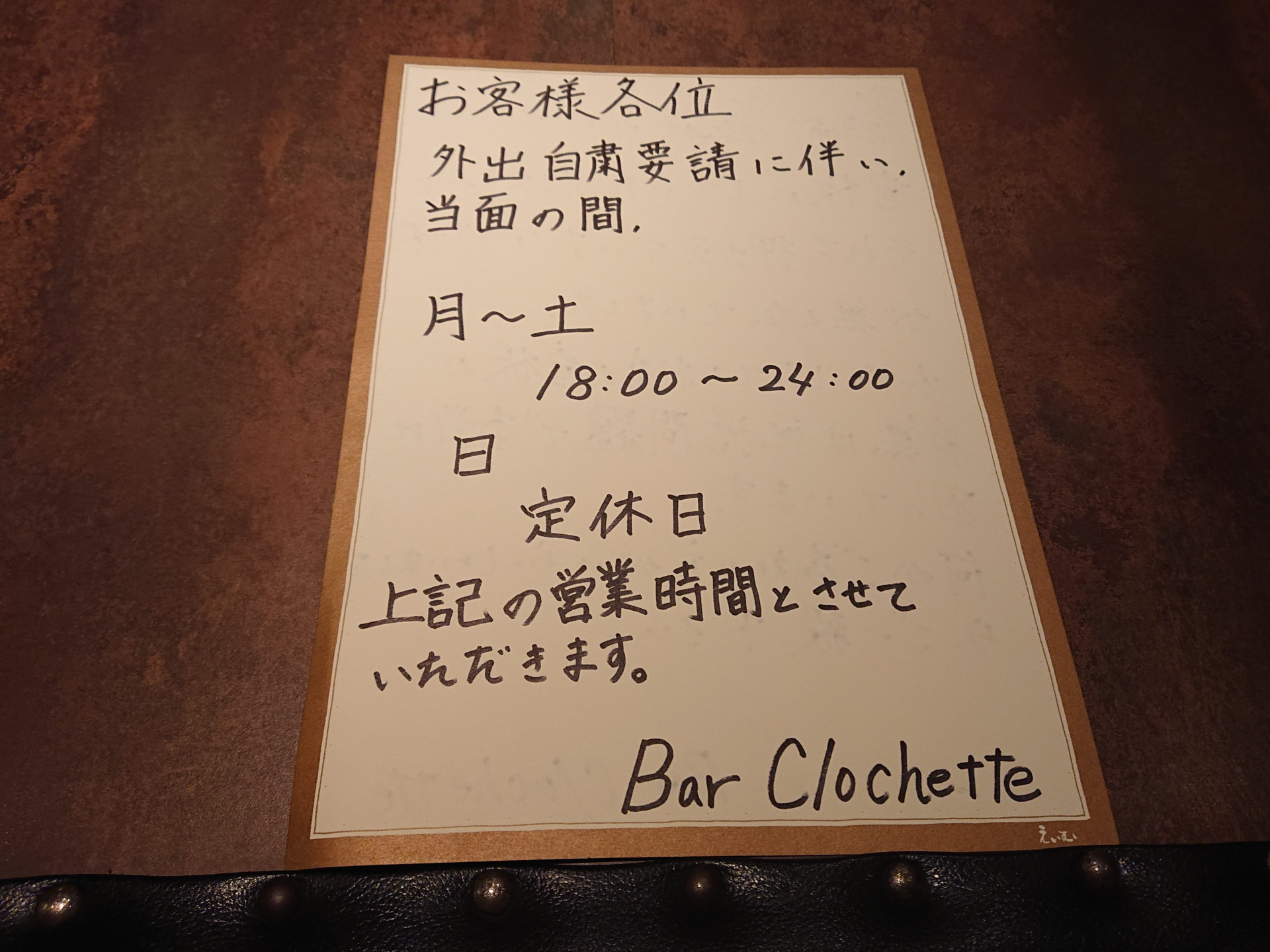 外出自粛要請に基づく営業時間の変更について 2020/04/03 西葛西 バークロシェットです。 再三営業時間の変更をお伝えして参りましたが、自粛の流れが強まった関係で、 月~土 18:00~24:00 日 定休日 とさせていただきます。 何卒ご理解のほどよろしくお願い致します。 西葛西 BarClochette