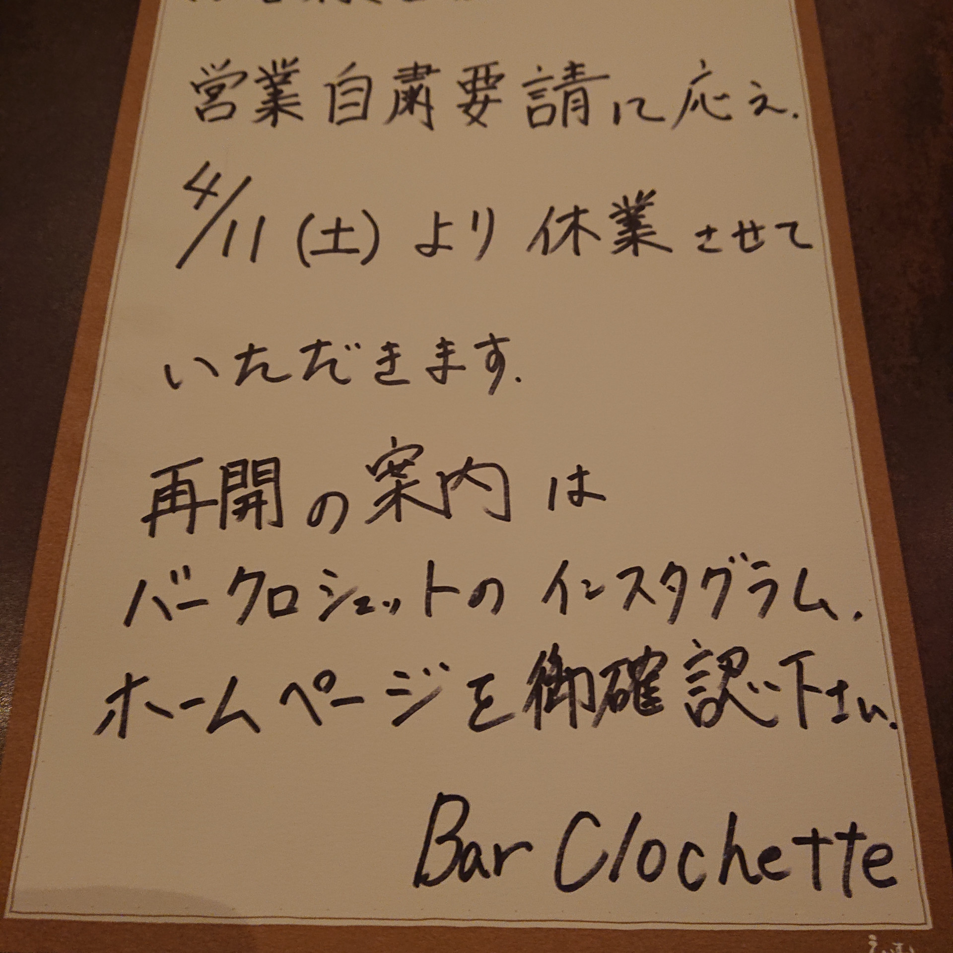 休業のご案内 西葛西 バークロシェット 2020/04/09 西葛西バークロシェットです。 4/11(土)より、自粛要請に応じ、しばし休業致します。 再開時期はまたホームページ、インスタグラムでお知らせ致します。 再開した暁には、変わらぬ御愛顧を賜りますようお願い申し上げます。 西葛西 BarClochette