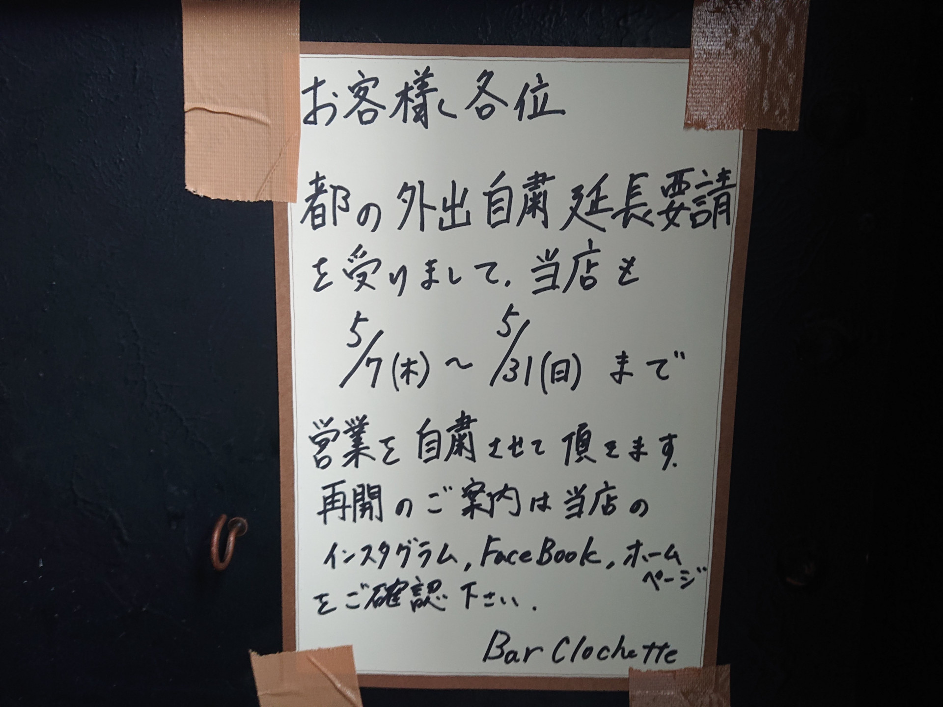 西葛西 バー クロシェットは営業自粛を延長する事を決定致しました。 2020/05/06 西葛西 バー クロシェットです。 東京都より外出自粛の延長要請が発表された事により、当店も自粛の延長を決定致しました。 1日も早い日常を取り戻せるよう東京都の決定を支持し、協力させていただきます。 オープン直後でこのような事になり不安でいっぱいですが、お客様の安全の為、バーテンダーというお客様を預かるプロとしての仕事として、自粛という決断を致します。 再開した折りには、皆様の御来店を心よりお待ちしております。 西葛西 BarClochette