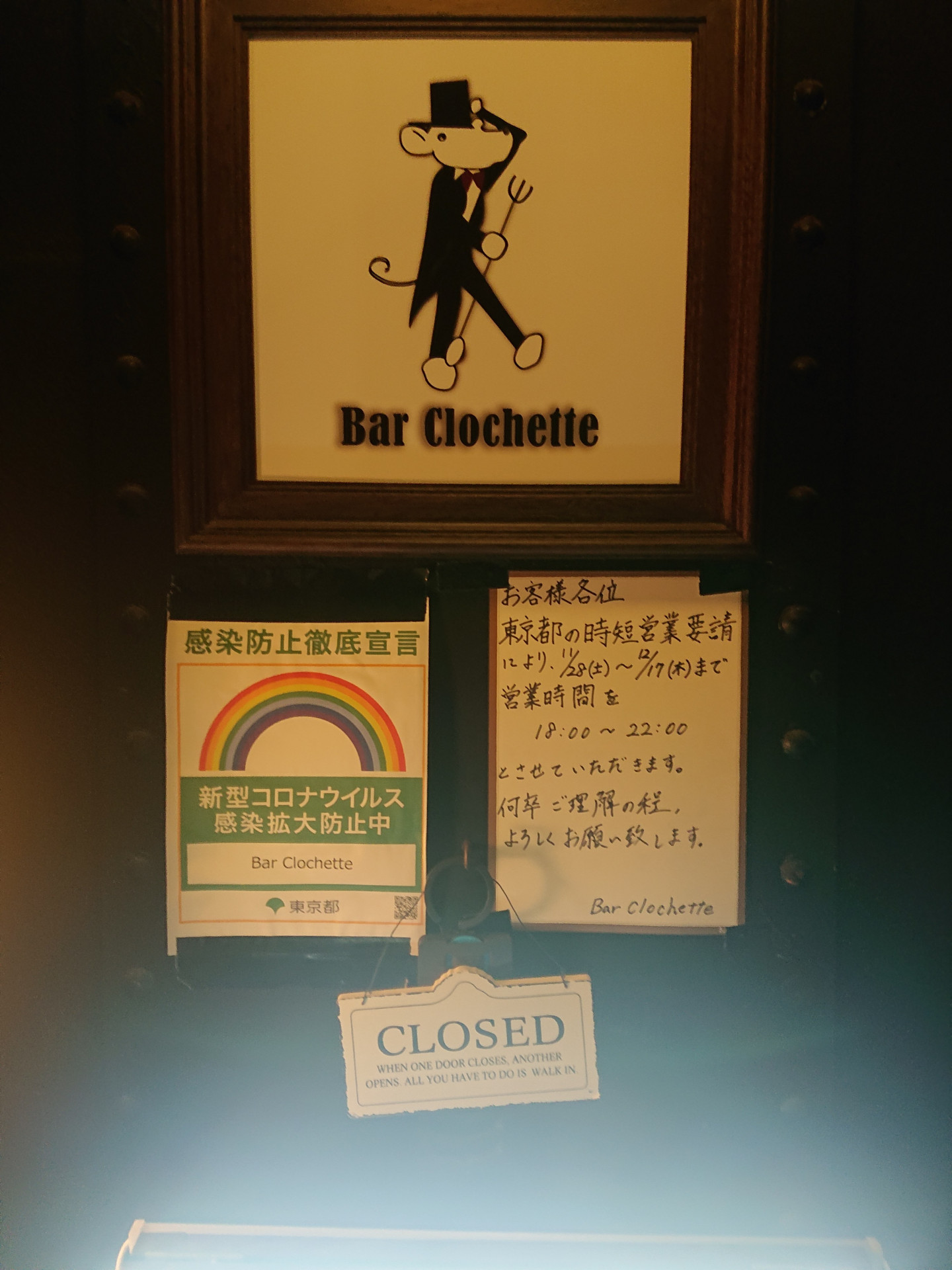 西葛西 バー クロシェット 12月の営業日とお知らせです。 2020/11/27 西葛西 バー クロシェットです。 12月の営業日とお知らせです。 年末最終営業日は12/30とさせていただき、年始は1/5より営業させていただきます。 お知らせですが、コロナウイルス感染拡大により、東京都からの営業時間の短縮要請の為、11/28(土)~12/17(木)まで、 18:00~22:00 の営業時間とさせていただきます。お客様にはご迷惑をおかけしますが、何卒ご理解の程よろしくお願い致します。 西葛西 Bar Clochette