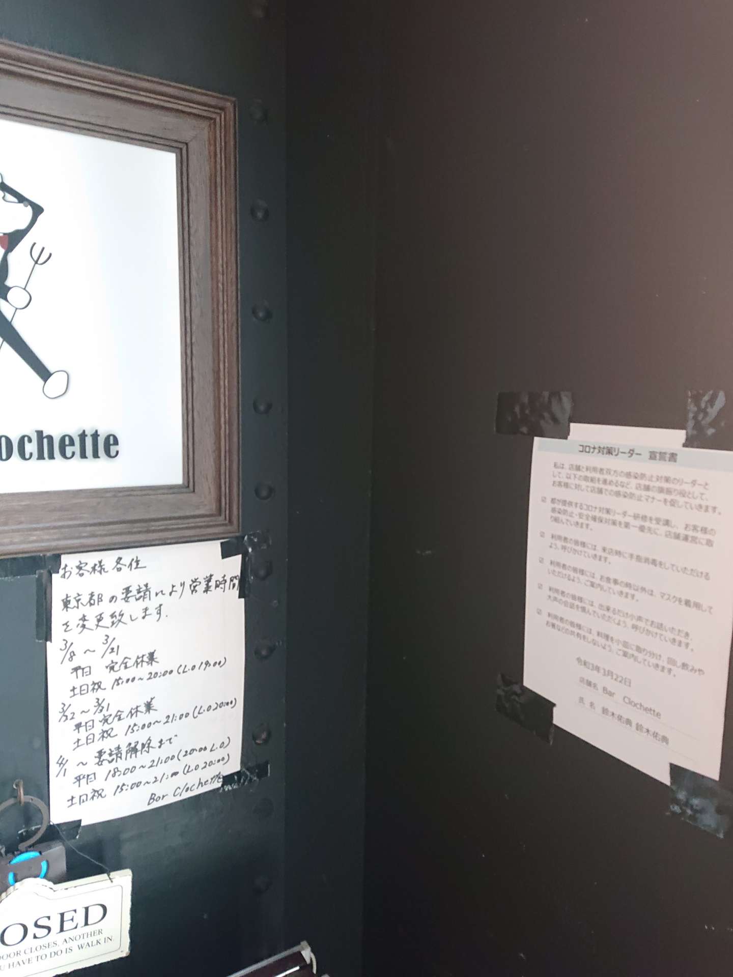 西葛西 バー クロシェット 4月より平日開始致します! 2021/03/31 西葛西 バー クロシェットです。 緊急事態宣言が終了し、段階的緩和期間により営業時間が変更しております。 3月中は平日を完全休業しておりましたが、4月より平日も営業致します。 平日 18:00~21:00(L.O20:00) 土日祝 15:00~21:00(L.O20:00) となります。皆様の御来店をお待ちしております。 西葛西 Bar Clochette
