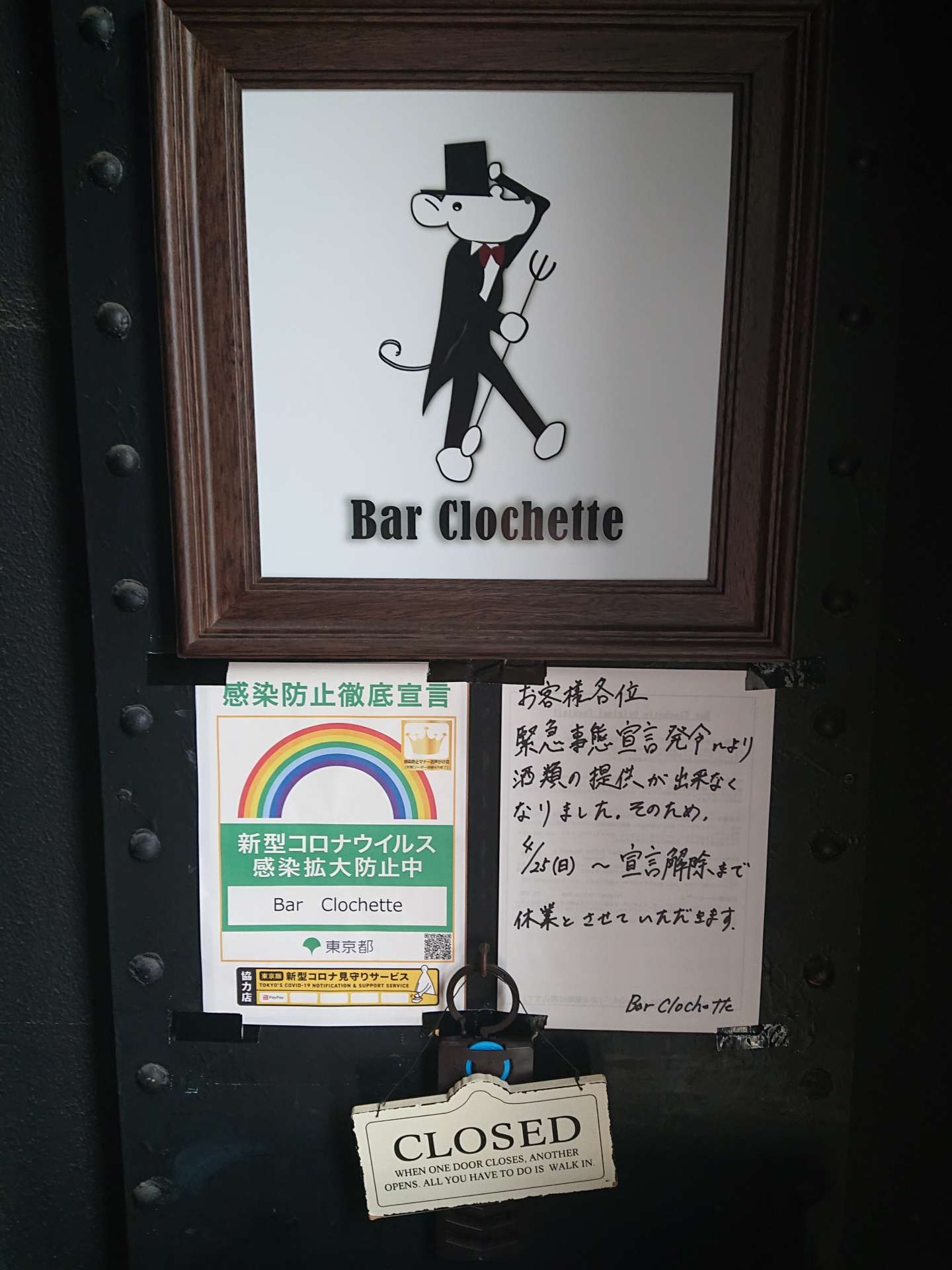 西葛西 バー クロシェット 休業のお知らせ 2021/04/24 西葛西 バー クロシェットです。 緊急事態宣言の発令に基づき、酒類の提供が出来なくなりました。 4/25~宣言解除まで休業させていただきます。 お客様には御不便をお掛けしますが、何卒ご理解の程、お願い申し上げます。 西葛西 Bar Clochette