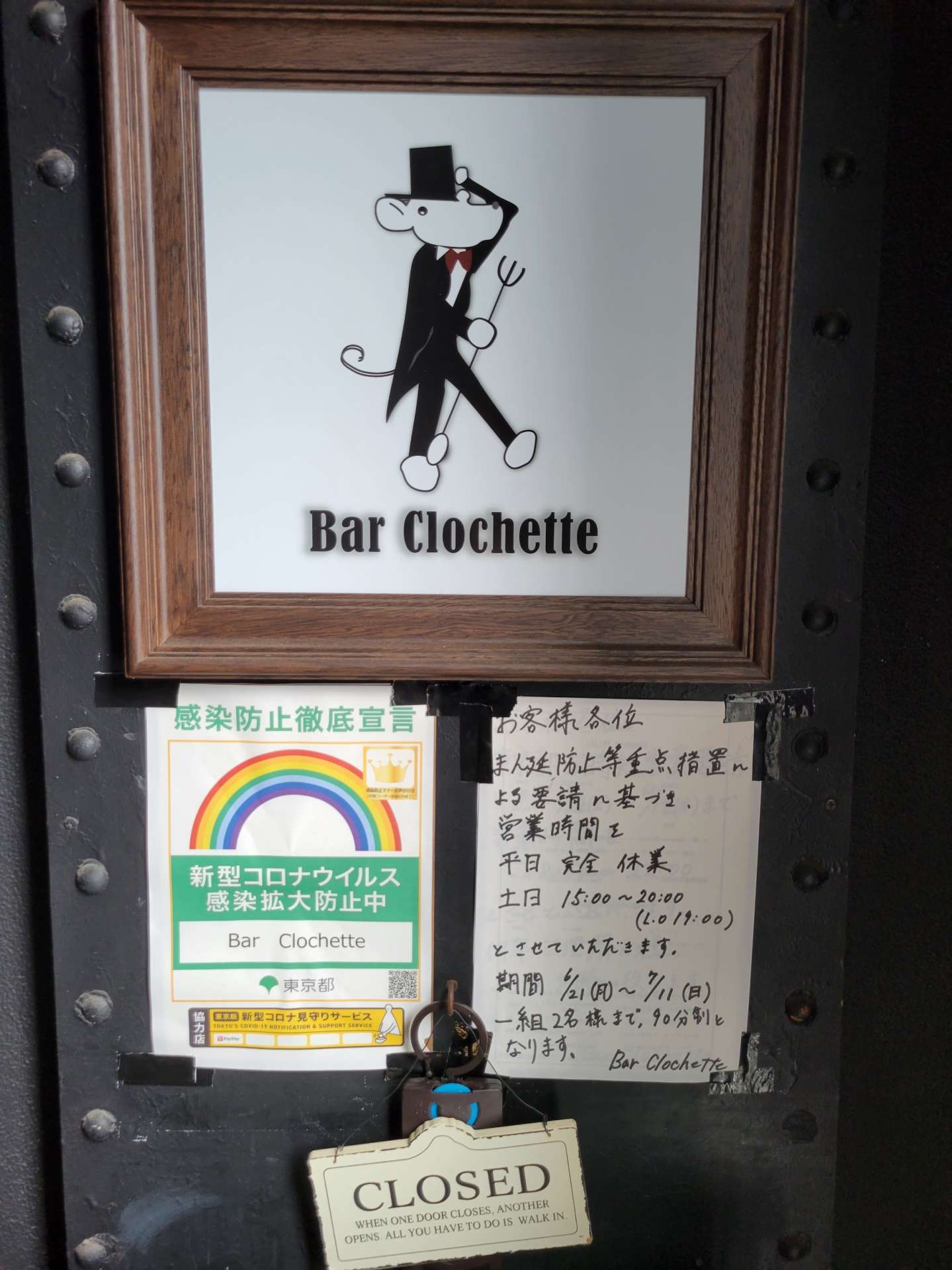 西葛西 バー クロシェット 営業時間の変更です。 2021/06/20 西葛西 バー クロシェットです。 まん延防止等重点措置による要請に基づき、営業時間の変更を致します。 平日 完全休業 土日 15:00~20:00(L.O19:00) とさせていただきます。 ご利用される人数も2名様まで、ご利用時間も90分制とさせていただきます。 お客様におかれましては御不便をお掛けしますが、何卒ご理解の程、お願い申し上げます。 西葛西 Bar Clochette