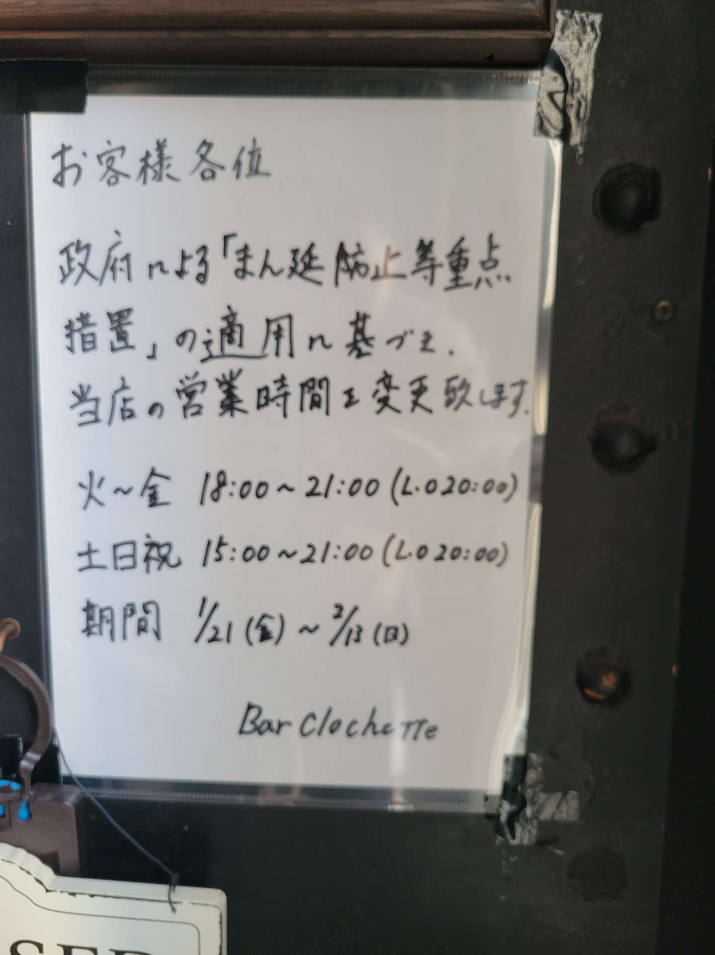 西葛西 バー クロシェット まん延防止等重点措置期間の営業時間について。 2022/01/20 西葛西 バー クロシェットです。 日夜報道にもあります通り、明日1/21(金)からまん延防止等重点措置が適用され、飲食店の営業時間が要請により短くなってしまいます。当店も要請に従いますので営業時間が変更されます。 火曜~金曜 18:00~21:00(L.O20:00) 土日祝 15:00~21:00(L.O20:00) 期間 1/21(金)~2/23(日) 定休日は変わらず毎月第一日曜日、毎週月曜日となります。 何卒宜しくお願い致します。 西葛西 Bar Clochette