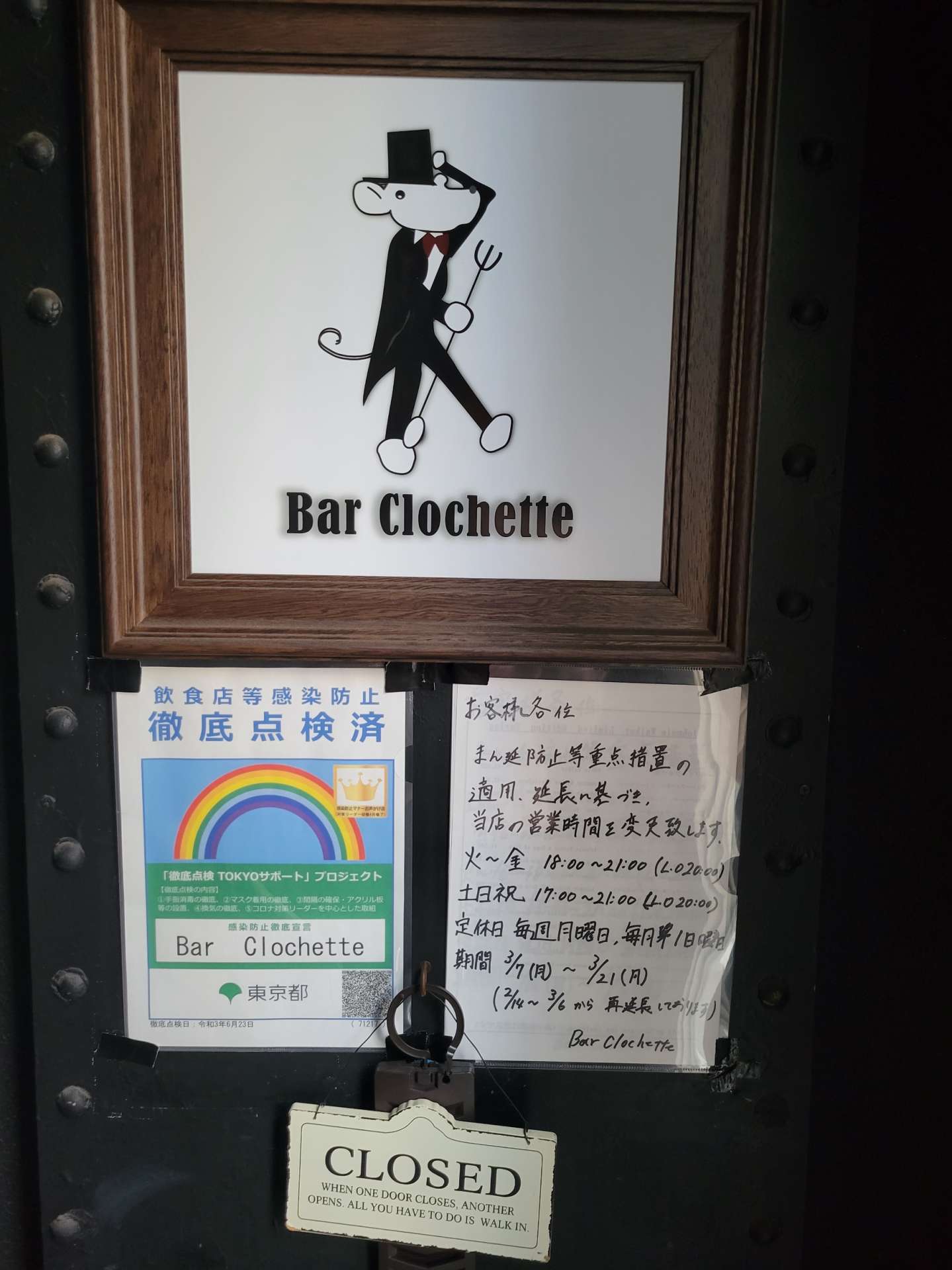 西葛西 バー クロシェット 来週の臨時休業のお知らせ 2022/03/12 西葛西 バー クロシェットです。 来週の頭に臨時休業をいただきます。 3/14(月) 定休日 3/15(火) 臨時休業 3/16(水) 臨時休業 3/17(木) 18:00~21:00(L.O20:00) 予め御了承ください。 西葛西 Bar Clochette