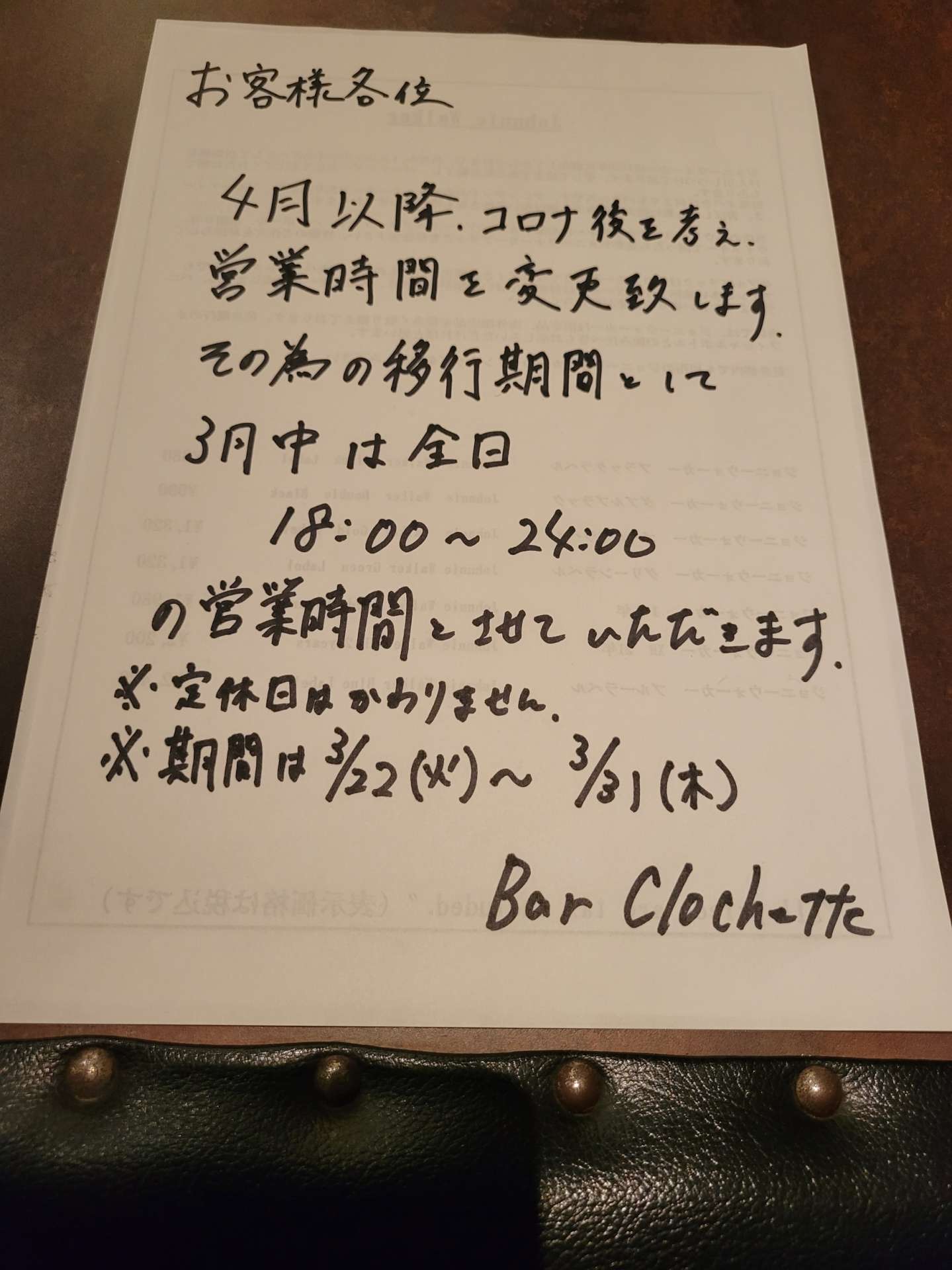 今回のご連絡はこの為3月22日以降の営業時間を移行期間として18:00~24:00の営業時間とさせていただくご連絡となります。