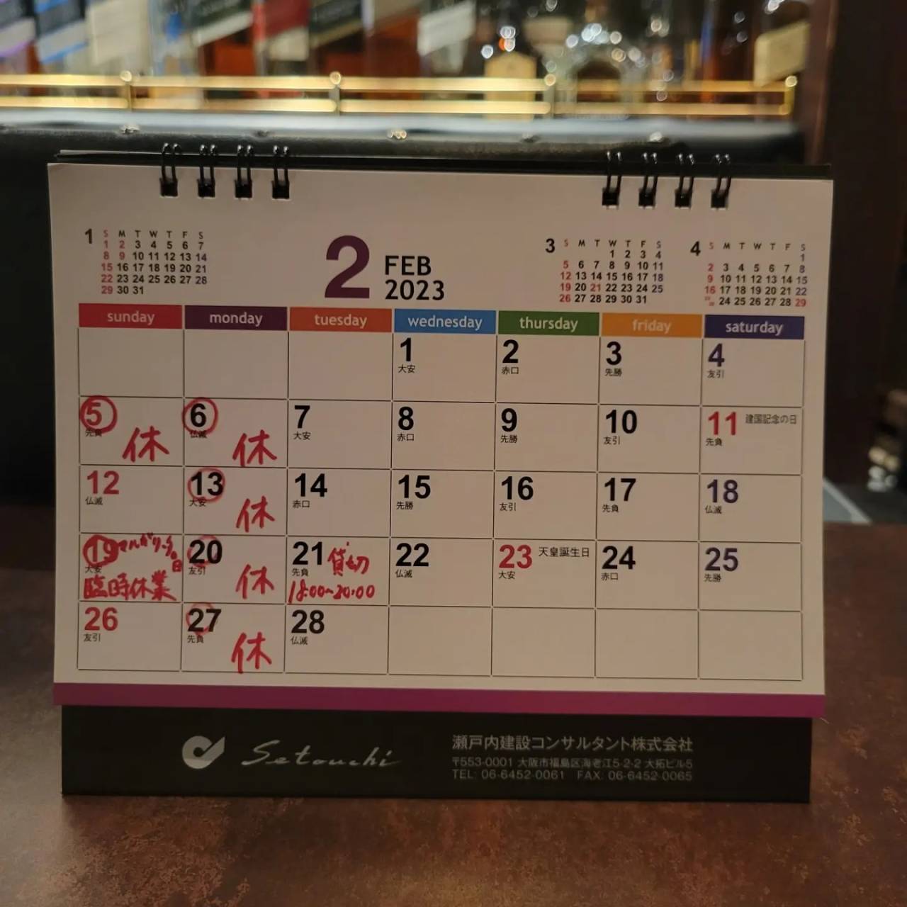 西葛西 バー クロシェット 2月の営業日のお知らせ 2023/01/31 2月の営業日のお知らせです。 毎週月曜日、毎月第一日曜日はいつも通り定休日ですが、2/19(日)もマルガリータの日出席の為、臨時休業とさせていただきます。 また2/21(火)は18:00~20:00まで貸し切りとなります。予め御了承下さい。 2月もよろしくお願い致します。