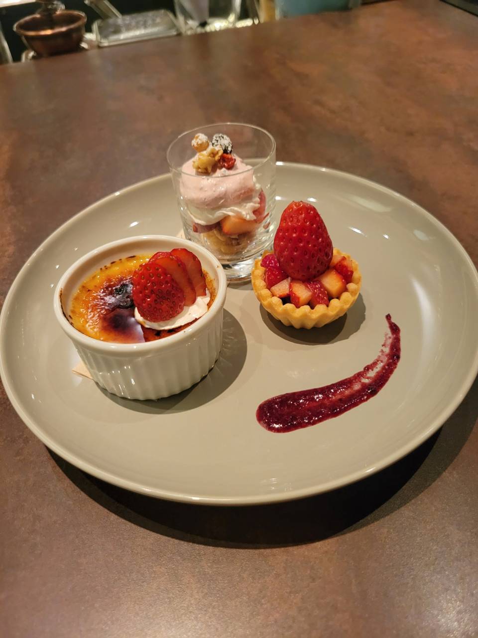 西葛西 バー クロシェット 新メニュースタート致します。 2023/03/01 西葛西 バー クロシェットです。 新メニュー<苺のデザートプレート> 上 苺とグラノーラのパフェ 右下 苺とチョコレートのタルト 左下 燻製ウイスキー風味のブリュレ 無くなり次第終了です。御注文御待ちしております。