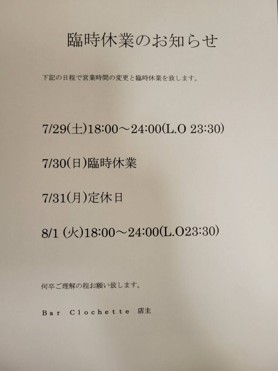 西葛西 バー クロシェット 今週末の営業時間の変更のお知らせ 2023/07/28 西葛西 バー クロシェットです。 今週末の営業時間の変更と臨時休業のお知らせです。 7/29(土)18:00~24:00(L.O23:30) 7/30(日)臨時休業 7/31(月)定休日 8/1(火)以降通常営業 岩手県にあります、「金ケ崎薬草酒造」様にて研修を受けて参りますので臨時休業となります。より良いお店にする為学んで参りますので、何卒御理解の程よろしくお願い致します。
