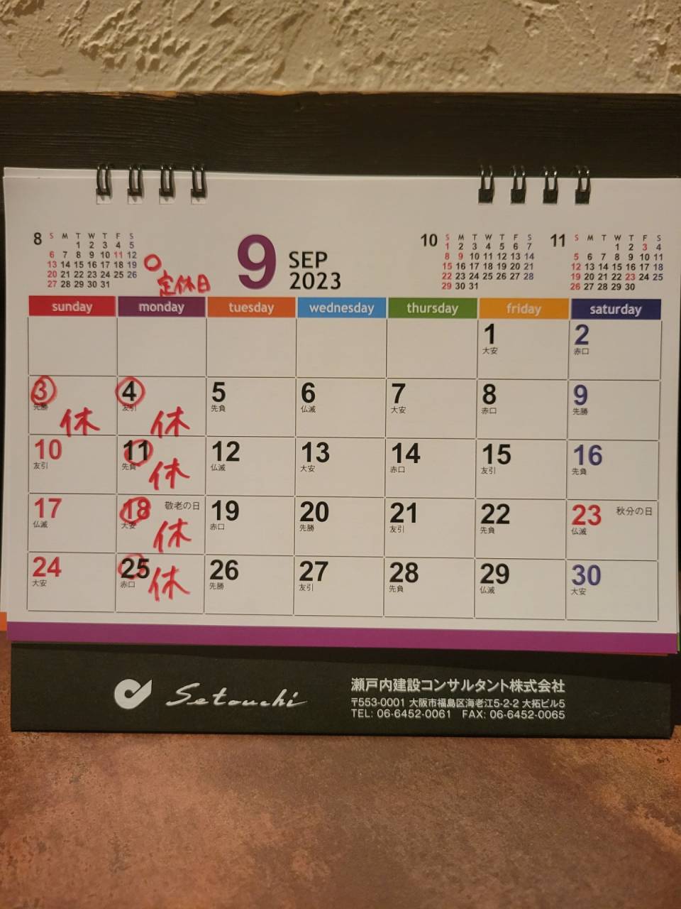 9月の営業日です。来月もよろしくお願い致します。