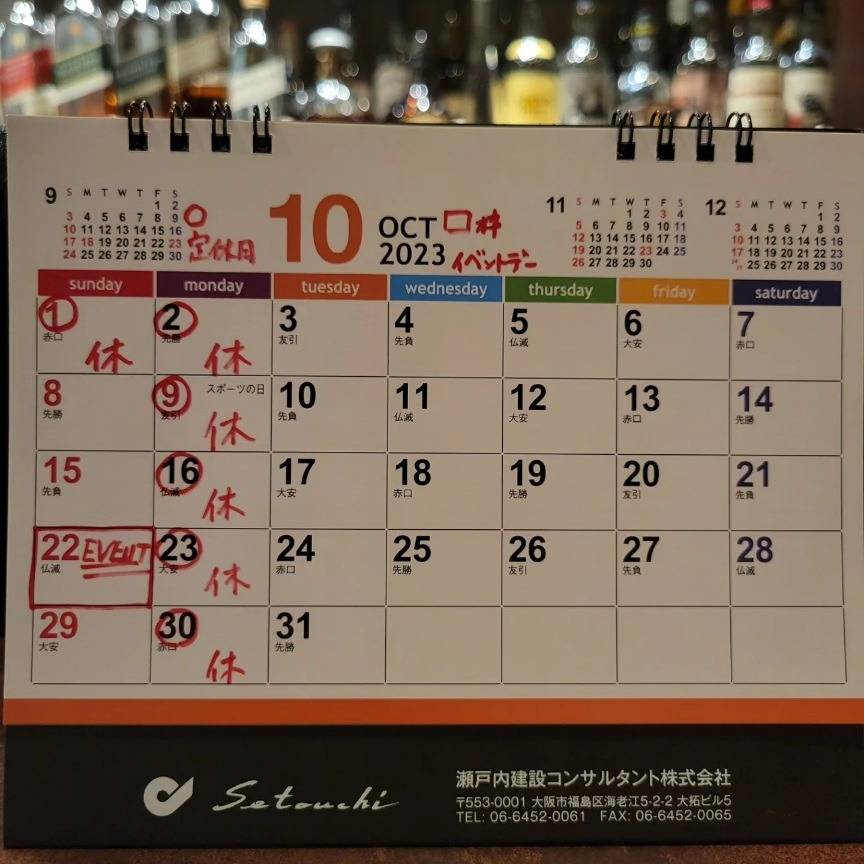来月の定休日の予定とイベントのお知らせです。