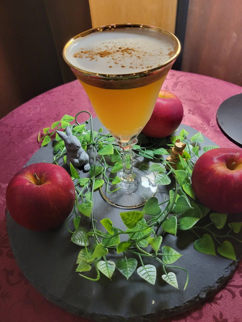 西葛西 バー クロシェット リンゴとシナモンのカクテル 2023/11/16 西葛西 バー クロシェットです。 最近のフレッシュフルーツカクテルの1つ。「リンゴとシナモンのカクテル」。本当にそのまんま。ダークラムを使用し、よりアップルパイに近づけた一杯。