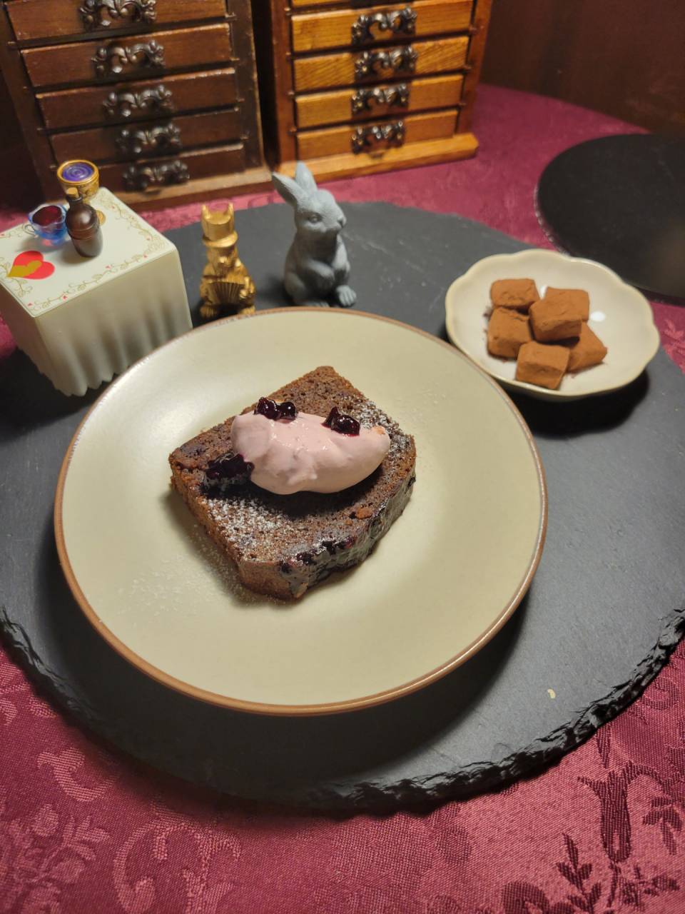西葛西 バー クロシェット 新メニューのお知らせ 2023/11/25 西葛西 バー クロシェットです。 新メニュー 中央「赤ワインとベリーのチョコパウンドケーキ」 右上「ジョニーウォーカーの生チョコレート」 秋の夜長のお供に是非。