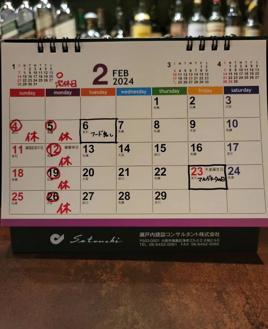 西葛西 バー クロシェット 2月の営業日とマルガリータの日のイベントのお知らせ 2024/01/30 西葛西 バー クロシェットです。 2月の営業日です。2月は定休日がいつもの通りなのと、6日(火)だけはフード無しでワンオペの営業となります。 そして23日は天王洲アイルにて、マルガリータの日のイベントです。私もサウザブルーブースにて、オリジナルのマルガリータを提供させていただきます。お時間のある方は是非チケットをご購入の上、ご参加下さい。皆様の御来場をお待ちしております。 …その後営業しますが、18時オープンには間に合いませんので戻り次第のオープンになります。何卒御理解の程お願い致します。
