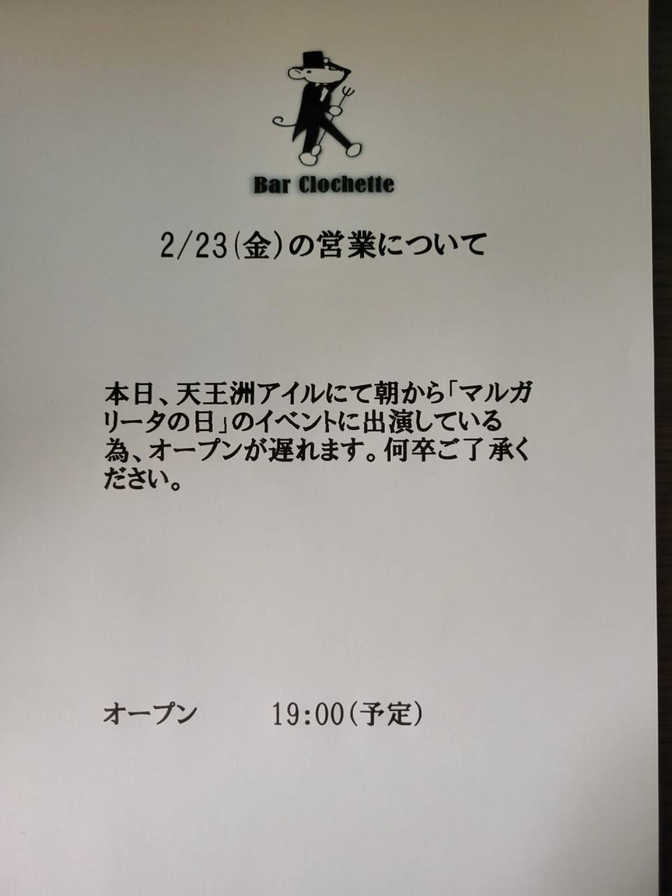 西葛西 バー クロシェット 23日の営業について 2024/02/23 西葛西 バー クロシェットです。 明日2/23(金)はマルガリータの日のイベントに出席するため、オープン時間が遅くなります。19時を予定しておりますが、遅くなる可能性があります。何卒御理解の程、お願い致します。