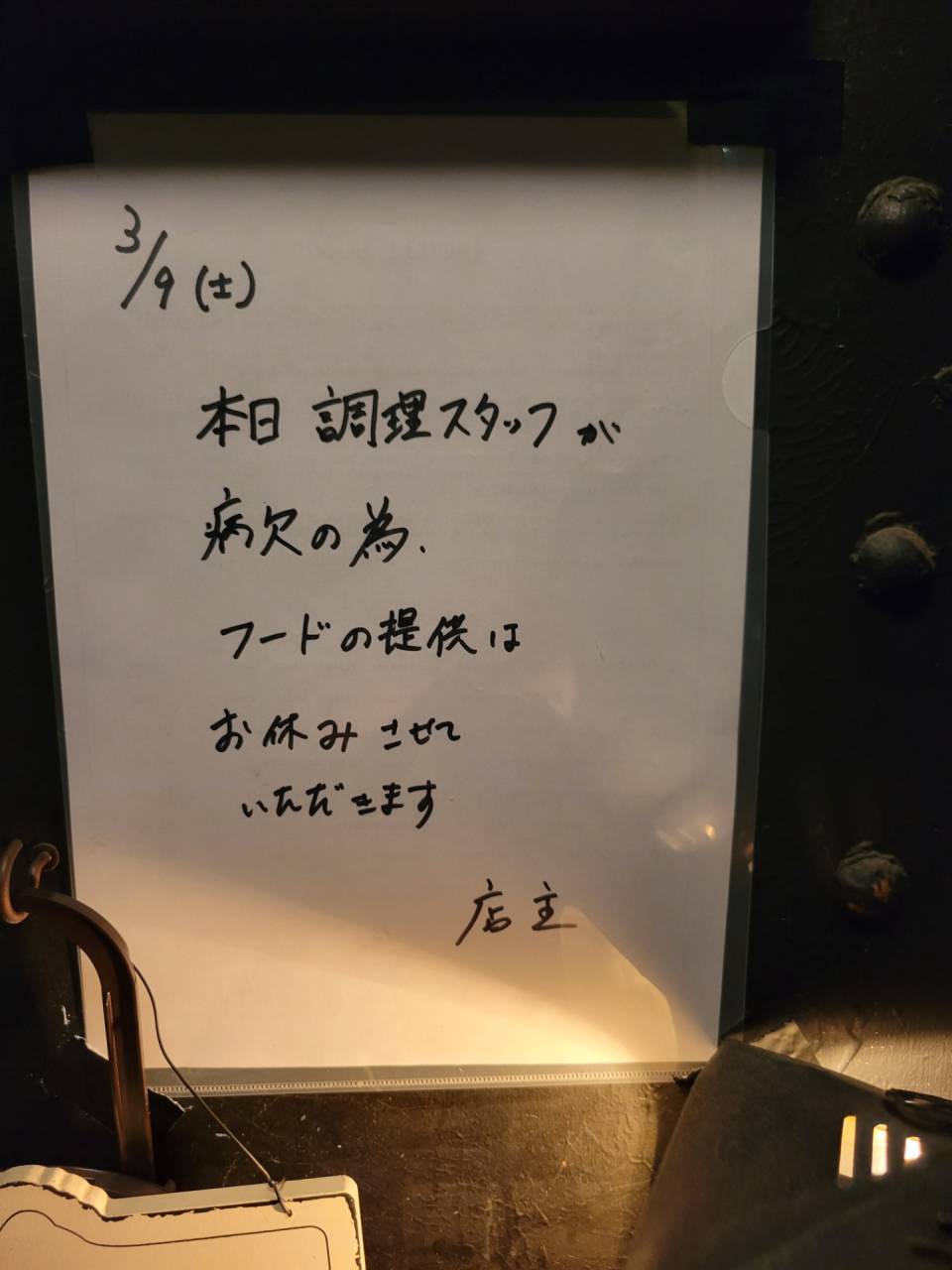 西葛西 バー クロシェット 本日フード提供はお休みさせていただきます。 2024/03/09 西葛西 バー クロシェットです。 本日は調理スタッフが病欠の為、フードの提供はお休みさせていただきます。何卒御理解の程、お願い致します。
