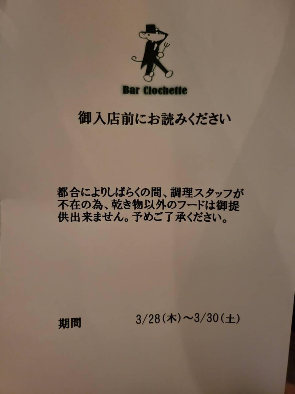 西葛西 バー クロシェット お知らせです。 2024/03/27 西葛西 バー クロシェットです。 明日3/28(木)~3/30(土)まで調理スタッフがお休みさせていただく為、フードは乾きもののみとなります。何卒御了承下さい。 ※注意※本日は調理スタッフはおります。明日からです。