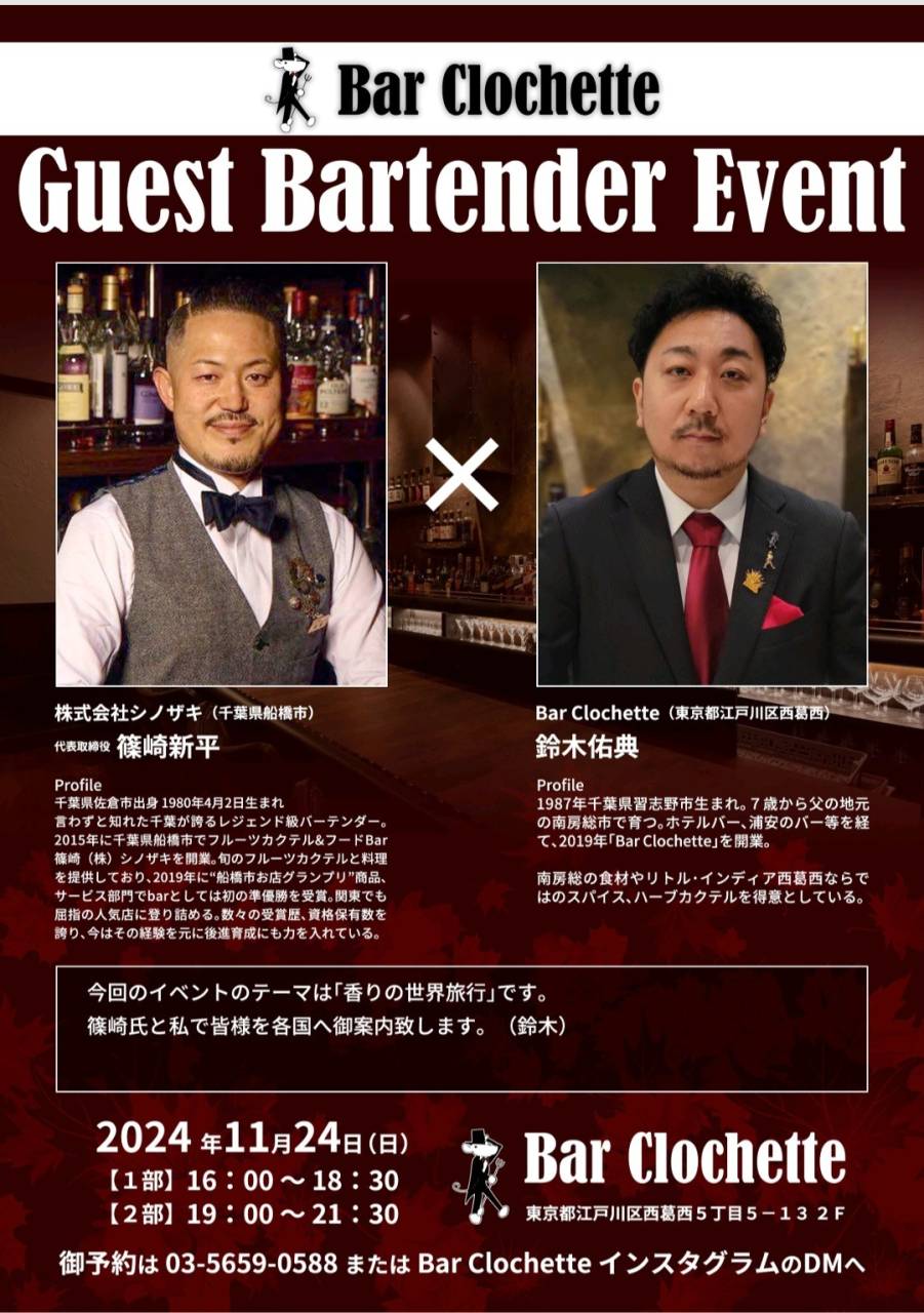 西葛西 バー クロシェット 11/24(日)イベント営業のお知らせ 2024/11/24 西葛西 バー クロシェットです。 11/24(日)は船橋の名店、バー篠崎の篠崎新平氏をお迎えし、ゲストシフトを行います。 その為、全日完全予約制、通常営業は行いません。何卒御理解の程、お願い致します。